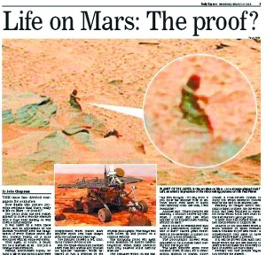 這張令人驚訝的火星照片顯示,在紅色星球的一處山坡上,一個腦袋碩大、如同“大腳怪”的黑色身影正揮著手臂走下火星山坡,它看起來又像是正坐在一塊石頭上休憩,還有人稱,照片上的“火星人”看起來像是一名女性。針對這幅“火星人”照片,英國《每日郵報》幽默地評論說:“她坐在一塊巖石上,像在等一輛公共汽車,不過如果真是這樣的話,她可能得面臨永無止境的漫長等待!薄短┪钍繄蟆穭t將這個“火星人”比喻成是藏得無影無蹤的本·拉丹:“它是一塊巖石,還是火星光線的錯覺?或者是本·拉丹在遠(yuǎn)離地球3億英里遠(yuǎn)的荒蕪藏身處朝地球揮手?”