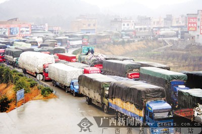 在現(xiàn)場(chǎng),全州縣公安局副局長兼交警大隊(duì)大隊(duì)長唐新文正率領(lǐng)數(shù)名交警指揮交通。他告訴記者,衡昆高速公路湖南段因路面結(jié)冰,湖南方面為防止出現(xiàn)重大交通事故,封閉了連接廣西的高速公路。近日,與湖南相接通的全黃高速公路路面也結(jié)冰,1月22日上午10時(shí)起全線封閉。不過,由南往北的大貨車還可以走322國道,經(jīng)黃沙河鎮(zhèn)進(jìn)入湖南境內(nèi)。但由于大貨車比較長,而且載重量大,加上這段路的路況復(fù)雜,貨車司機(jī)擔(dān)心路上不安全,所以都想等到全黃高速路放行后再走,以致滯留的大貨車越來越多。