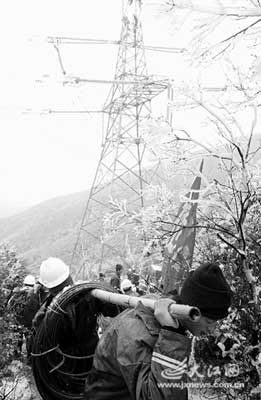 29日,一場大雪飄落南昌。12時(shí)30分,記者登上梅嶺主峰,來到海拔近千米的南夢(mèng)線72號(hào)鐵塔,這是江西電網(wǎng)大動(dòng)脈的一環(huán),它的修復(fù)以及再次運(yùn)行將把來自三峽的“血液”直輸我省,填補(bǔ)1/3的用電缺口。