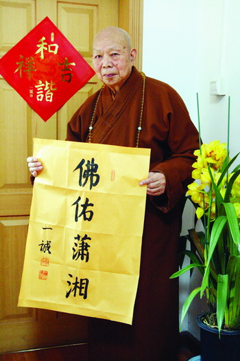 坐在北京廣濟(jì)寺中國佛教協(xié)會辦公室里,全國政協(xié)常委、中國佛教協(xié)會會長一誠大和尚不禁面露愁云,為家鄉(xiāng)湖南遭遇雪災(zāi)而擔(dān)憂著。80高壽的一誠大和尚用稍微有點(diǎn)顫抖的手提起了筆,飽含深情地寫下了“佛佑瀟湘”四個大字,“祈愿家鄉(xiāng)湖南能永離災(zāi)難,人們幸福安康”。為此他還準(zhǔn)備為家鄉(xiāng)捐出5萬元。