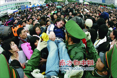 廣州火車站廣場,一位暈倒的旅客被接力式從等待進(jìn)站的人群中送出,武警隨后將她抬至正對著火車站進(jìn)站大廳的臨時(shí)醫(yī)療中心。張駿攝
