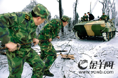 如位于位于粵湘交界處廣東第一峰大東山半山腰的星子鎮(zhèn)潭嶺村,通往山下的唯一一條12公里水泥路結(jié)上了十多厘米厚的冰層,4000多村民被困在山上,由于停電,碾米機(jī)無(wú)法運(yùn)轉(zhuǎn),村民的籌備糧很快吃光,連喂豬的飼料都要吃光了,已經(jīng)陷入絕境。得悉這種情況后,廣州軍區(qū)某部緊急派出官兵和兩輛裝甲運(yùn)輸車(chē)以及推土機(jī)、大卡車(chē)等奔赴受災(zāi)山區(qū),一路上,領(lǐng)導(dǎo)帶頭揮舞榔頭、鐵鏟奮力破冰開(kāi)路,協(xié)助連州當(dāng)?shù)卣岩慌竺、棉被、柴油碾米機(jī)等救援物資迅速送到受困群眾手中。(記者 覃明章 記者 黃瓊 尹政軍 通訊員 楊小剛 鄒庭松 陳楚然 韓志軍/攝影)