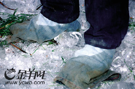 圖:路面上結(jié)了十多厘米厚的冰層,村民在鞋外包布防滑。