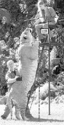 該動(dòng)物園內(nèi)的一只成年獅虎獸“赫拉克勒斯”目前已經(jīng)長(zhǎng)到3.7米長(zhǎng),體重超過(guò)了500公斤!當(dāng)動(dòng)物園的馴獸師奇娜·約克給“赫拉克勒斯”喂食時(shí),盡管她站在了一個(gè)4米多高的支架上,但“赫拉克勒斯”仍輕易地站起了整個(gè)身子,并抓取到了奇娜手中的食物。雖然美國(guó)邁阿密稀有瀕危物種協(xié)會(huì)的環(huán)保專(zhuān)家布哈加文·安特爾博士仍勇敢地站在它身邊,但安特爾的身高只有“赫拉克勒斯”的一半。