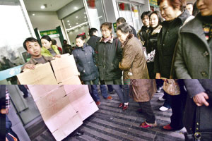 昨日中午1時(shí)許,兩名男子和一名婦女來到儲(chǔ)蓄所門前,高舉一個(gè)寫有“我在這里取到假錢”的紙牌子。舉牌子的男子叫汪登渝,長壽人,是進(jìn)城務(wù)工的農(nóng)民工。“我昨天中午在這取了5000元準(zhǔn)備借給小舅子,半小時(shí)后我們走到家樂福后發(fā)現(xiàn)錢是假的!蓖粽f,當(dāng)時(shí)他在自動(dòng)取款機(jī)上分三次取錢(前兩次各取2000元,第三次取1000元),點(diǎn)清數(shù)額后將現(xiàn)金和卡帶離儲(chǔ)蓄所,隨后來到家樂福買東西時(shí)發(fā)現(xiàn)異常,“我看到錢上的頭像是黃色的,就覺得有問題!蓖舻男【俗狱S先生說。不過,對(duì)于汪登渝半小時(shí)內(nèi)的行程,只有其小舅子能夠作證。
