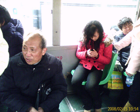 “雖然這樣,但該女子假裝沒有聽見,依舊坐在那里發(fā)她的短信,我抱著孩子在其旁邊站了一會,該女子還是依然如故,好在很快有人下車了!本W(wǎng)民“techuen333666”說,于是,他抱著孩子坐在駕駛員后面的工具箱上,用手機(jī)給那個搶座的女子拍了照片。