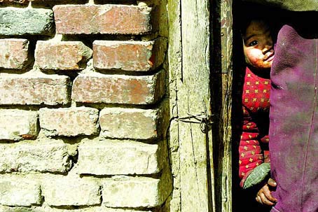 臟亂的床上,一個(gè)男嬰躺著睡覺(jué)。大點(diǎn)的孩子告訴記者,他叫“鵬鵬(音)”,他還會(huì)數(shù)數(shù),說(shuō)起大弟弟的年齡,他伸出兩個(gè)指頭說(shuō),弟弟兩歲了。
