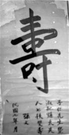 昨日上午,在綿陽市一位收藏者家中,記者見到其新近收藏的一件賀壽書法珍品:一張大紅榜紙(朝廷發(fā)金榜用紙)上,斗大的繁體 “壽”字,勻稱、飽滿、遒勁,十分工整。落款清楚,其中單獨成行的“孫文”兩字非常醒目(右圖)。