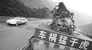 周先生所看到的長安車是一次車禍?zhǔn)鹿实臍埡。記者在現(xiàn)場看到,殘骸車被擺放在一個(gè)大約2米高的水泥展臺(tái)上,3個(gè)輪胎缺失,因?yàn)槭艿街貏?chuàng),已經(jīng)成了一團(tuán)廢鐵,幾根鋼絲將其牢牢捆在展臺(tái)上!三關(guān)寺中橋位于319國道彭水境內(nèi),橋下是四五十米的懸崖。從黔江方向過來有一個(gè)90度左右的彎道,彎內(nèi)是石壁,兩邊不能互見,非常危險(xiǎn)。殘骸展臺(tái)就在彎外路邊,展臺(tái)上寫著“車禍猛于虎”幾個(gè)大字,被司機(jī)稱為“救命展臺(tái)”。