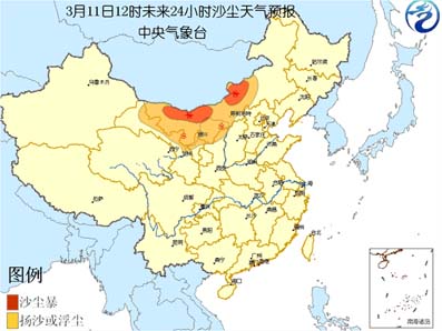 中新網3月11日電 中央氣象臺今天上午十時繼續(xù)發(fā)布沙塵天氣預報:受東移冷空氣影響,預計今天中午到明天中午,甘肅河西走廊、內蒙古中西部、寧夏北部、陜西北部等地有揚沙或浮塵天氣,內蒙古中西部偏北的部分地區(qū)有能見度小于1000米的沙塵暴。