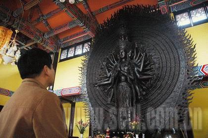龍泉石經(jīng)寺內(nèi)雕成的東南亞最大烏木千手觀音,所用烏木據(jù)測已有7000年歷史。昨(11)日,這尊千手觀音首次亮相,展露祥容。本月22日,石經(jīng)寺將舉行盛大開光儀式,(四川)省內(nèi)外高僧大德云集,并進行學(xué)術(shù)研討,烏木千手觀音將正式向游人開放。