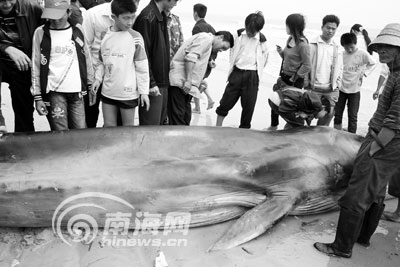 3月11日凌晨4點(diǎn)多鐘,文昌市錦山鎮(zhèn)富宅村村民老韓在潮灘港附近海邊,發(fā)現(xiàn)一條因落潮而擱淺死亡的鯨魚。
