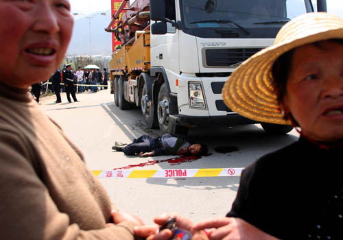 上午12時(shí)30分許,記者趕到現(xiàn)場(chǎng),看到一輛黃色的混凝土輸送泵車被人群包圍著,一位身穿黃色制服的交通征稽執(zhí)法人員,坐在駕駛室里趴在方向盤上一動(dòng)不動(dòng)。記者擠進(jìn)人群看到,一位中年民工躺在車的右前輪子前面的血泊中,人已經(jīng)死亡。周圍的群眾、游客情緒激動(dòng),指著車上的執(zhí)法人員罵聲一片。