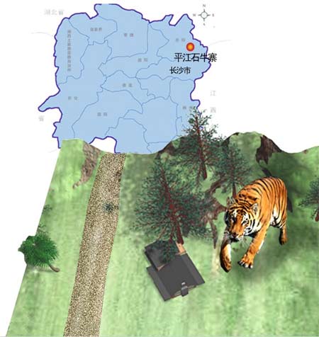 2006年10月30日,平江縣虹橋鎮(zhèn)洞口村七星巖電站閃石巖驚現(xiàn)虎蹤。據(jù)目擊者魏強(qiáng)根說,該動(dòng)物體長(zhǎng)約1.3米以上,渾身是條形斑紋,在地上留下的足印有10多公分寬。