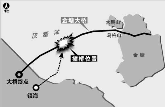 昨天凌晨,一艘臺州籍貨輪撞上了施工中的金塘大橋。兩塊重達(dá)3000多噸的鋼筋混凝土砸在了貨輪的駕駛艙上。
