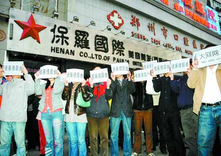 這一群由大河網(wǎng)-大河論壇的網(wǎng)友自發(fā)組成的閃客行動(dòng),在保羅國(guó)際門(mén)口舉行抗議活動(dòng)。他們將寫(xiě)著“很黑很后臺(tái)”的十六開(kāi)紙舉在頭頂,表示他們對(duì)保羅國(guó)際的不滿(mǎn)。