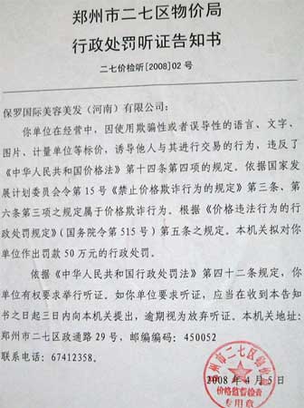 告知書上稱,“你單位在經(jīng)營中,因使用欺騙性或者誤導(dǎo)性的語言、文字、圖片、計(jì)量單位等標(biāo)價(jià),誘導(dǎo)他人進(jìn)行交易的行為,違反了《價(jià)格法》第十四條第四項(xiàng)的規(guī)定,屬于價(jià)格欺詐行為……本機(jī)關(guān)擬對你單位作出罰款50萬元的行政處罰!