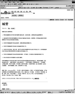 據(jù)了解,“百度百科”自稱(chēng)是一部由網(wǎng)友共同撰寫(xiě)的百科全書(shū)。網(wǎng)友要想讓自己的詞條被收錄,必須得到百度管理員的批準(zhǔn),如果含有色情、暴力、恐怖、不文明內(nèi)容的詞條,將不能成功上傳或遭刪除。惡搞“城管”一詞的釋義,就是4月3日由網(wǎng)友上傳上去的。