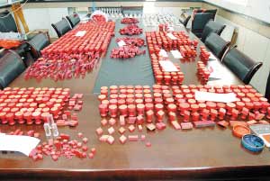 前日晚10時(shí),公安南開(kāi)分局治安科、王頂?shù)膛沙鏊、萬(wàn)興派出所采取聯(lián)合行動(dòng),對(duì)華章里張某的暫住地實(shí)施突擊清查。張某絲毫沒(méi)有料到警察會(huì)深夜光臨,聽(tīng)到敲門(mén)聲還以為有客前來(lái)取證便打開(kāi)了房門(mén)。民警立即將其控制住并迅速?zèng)_入屋內(nèi),只見(jiàn)其外甥女王某正坐在里屋電腦前認(rèn)真制作一份高校畢業(yè)證書(shū),桌上還散亂地?cái)[放著許多打印出來(lái)的半成品。經(jīng)過(guò)對(duì)室內(nèi)細(xì)致搜查,民警先后從衣柜、抽屜及床下分別搜出用來(lái)制販假證的偽造的各部門(mén)公章、鋼印印模1000多枚,不僅全國(guó)各大名牌高校的公章及校長(zhǎng)名章一應(yīng)俱全,還有各種行政事業(yè)機(jī)關(guān)部門(mén)的公章,甚至還有公安機(jī)關(guān)基層派出所的戶(hù)籍專(zhuān)用章及民警名章。同時(shí)還搜出大量空白假證半成品3000多冊(cè),既有各種畢業(yè)文憑,也有各部門(mén)資質(zhì)證書(shū),其中包括已經(jīng)制作好的各類(lèi)假證10余件。