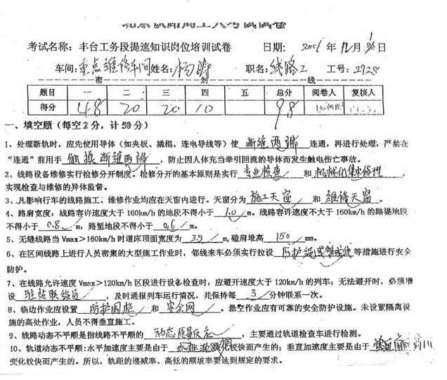 一審過程中,北京市鐵路局提供了一份試卷,法院據(jù)此認定“從其工作狀態(tài)及崗位培訓考試成績來看,其智力、精神狀況未受影響。”對于法院用一份試卷否定司法精神醫(yī)學鑒定結(jié)論,黃樂平律師難以理解:“在一審中,楊濤的親屬多次否認單位遞交的試卷的真實性,并向法院遞交了楊濤的筆跡,以供一審法院查明事實。但是,法院最終還是憑這份有偽造嫌疑的試卷,推翻專業(yè)司法鑒定機構所作的司法精神鑒定!
