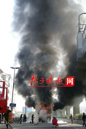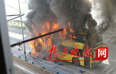 昨天上午7時55分,一輛雙層100路公交車在南京市雨花西路高架橋沿線尾部發(fā)生自燃,濃煙升騰數(shù)十米。時值上班高峰,公交車內(nèi)有乘客60多位。一騎車上班的市民發(fā)現(xiàn)火情后,奮追100多米,向駕駛員通報火情,隨即司機停車并及時疏導乘客,后因火勢太大,公交車瞬間成了“火”車,還危及地鐵中華門站10多米高正在運行的地鐵線。隨即,消防官兵趕到現(xiàn)場,撲救大火。整個過程中,沒有乘客受傷。但是大火將公交車燒成了一個空殼,烤化了附近的店家門面招牌,熏黑了地鐵柵欄,道路旁的植物也被烤死。