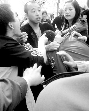 13日15時25分,讀者張先生撥打本報熱線反映說,數(shù)人正圍毆執(zhí)法人員。幾分鐘后,記者趕到現(xiàn)場,兩名執(zhí)法人員躺在地上,其中劉奇嬌已經(jīng)昏迷,旁邊有嘔吐物,同事張君毅正掐著他的人中,緊急搶救。王某在旁邊高聲叫喊:“執(zhí)法人員打人了。”然而,正在圍觀的群眾張林友讓記者看了他用手機拍的照片,生氣地說:“真是惡人先告狀,是他們喝酒后打執(zhí)法人員的!