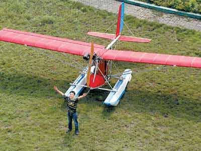 昨日上午9點,彭聰和4名“機務(wù)成員”開始組裝水上飛機。記者看到,整個飛機由鋁制管件制成,前翼為紅色的航空帆布,后翼由紅、黃相間的航空帆布組成。飛機的升降舵、垂直和水平安定面、測速表、高度表一應(yīng)俱全。