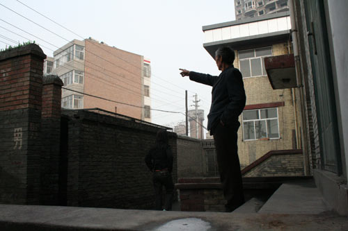 趙七明在一高一矮兩名法警的看護(hù)下,從通往廁所的法庭側(cè)門走出。下6級(jí)水泥臺(tái)階,再橫穿最底層臺(tái)階與廁所之間1.8米寬(本報(bào)記者4月14日測量所得數(shù)據(jù),下同)的一條巷道,就到了廁所門前。