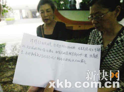 昨日追悼會(huì)舉行前,到場(chǎng)幾家媒體記者擔(dān)心打擾譚母,一直未曾上前與其交談,只是遠(yuǎn)遠(yuǎn)看著,直到譚靜好友都已經(jīng)到齊,追悼會(huì)馬上開(kāi)始的時(shí)候,觀察譚母精神略好了一些方才走近,向其問(wèn)好后交談了不到一分鐘,期間譚母聽(tīng)得多,回答得少,在采訪的最后,譚母忽然從包里拿出一張事先寫(xiě)好的紙條展開(kāi),“要說(shuō)的全在里面了!庇浾呖吹,紙條上寫(xiě)著如下的話語(yǔ),“譚靜是個(gè)自強(qiáng)自愛(ài)、活潑開(kāi)朗的好女孩,自殺是絕對(duì)不可能的,至于說(shuō)她每日喝酒度日,和有關(guān)她爸被害前大吵一架,純屬謠言,這事情就到此為止吧,別再讓我們雪上加霜了!闭故就昙垪l后,譚母回到靈堂里參加追悼會(huì)了。