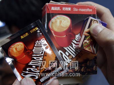 火鳳凰成人保健用品公司的貨架上還擺了一種催情咖啡,沒有廠名、廠址,方形外包裝與雀巢咖啡十分近似,每盒有8小袋。說明稱每袋催情咖啡對(duì)入150毫升開水沖泡,30分鐘見效。店員稱其口感與速溶咖啡類似,批發(fā)價(jià)每盒18元。