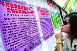 昨天上午,南京師范大學(xué)一號(hào)宿舍樓門前的布告欄前,幾名女同學(xué)正圍著兩張海報(bào),指指點(diǎn)點(diǎn)。兩張海報(bào)的內(nèi)容相同,標(biāo)題赫然寫著:“千萬(wàn)富翁征素質(zhì)美女 定情禮物為名車一輛”。正文為:“我時(shí)年35歲,身高1.70米,畢業(yè)于國(guó)內(nèi)知名學(xué)府,也算是‘天生我材’,人盡其用,現(xiàn)自營(yíng)一家公司,貌顯年輕。公司業(yè)務(wù),蒸蒸日上,目前資產(chǎn)數(shù)千萬(wàn)。生活上我一直追求‘真情無畏風(fēng)雨來的伴侶’,曾經(jīng)滄海,有過一段短暫的婚姻,心目中理想的她:80年后,身高1.60—1.68米之間,本科以上學(xué)歷,容貌秀麗,談吐有致,高雅職業(yè),大學(xué)老師、在校碩士為佳,心地善良,孝順顧家。如有緣,我會(huì)送您一輛名車作為我們的定情之物。希望明年金秋十月將是你我新婚的喜悅……”