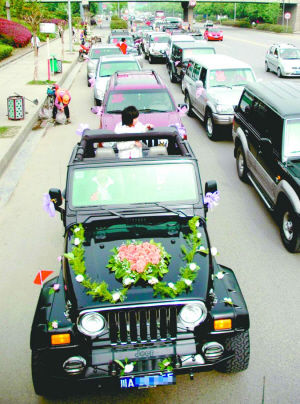 三菱帕杰羅、陸地巡洋艦、大切諾基、豐田普拉多、本田CRV、牧馬人……昨日上午,52輛各種品牌的越野車,組建成綿延1公里長的婚車隊伍,從西門穿城到東門迎娶美麗的新娘子,又浩浩蕩蕩地朝東湖公園婚禮現(xiàn)場進發(fā),好不拉風(fēng)!新娘子說:“戀愛8年啦,就想要這么一場轟轟烈烈的婚禮!”