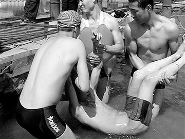 此時,一個穿著泳褲的30歲左右的男子扒開人群,跳進冰冷的湖水中,同消防官兵一起搜尋溺水者。“那個小伙聽說消防官兵在救人,趕緊跑到附近游泳館買的泳褲!蹦繐粽邊卿h告訴記者。