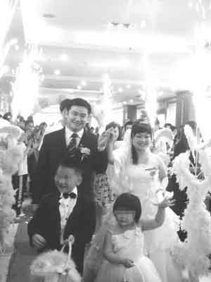 中午12時(shí)30分,婚禮正式開(kāi)始。叮叮和小伙伴一人手提一個(gè)裝滿(mǎn)花瓣的小花籃,在玫瑰花亭下站好。當(dāng)主持人宣布新人入場(chǎng)時(shí),兩人相對(duì)而立,隨后帶領(lǐng)新郎新娘緩緩踏上紅地毯。叮叮右手提著花籃,左手抓起一把玫瑰花瓣,用力向空中撒去,始終笑呵呵的,直到把新人帶到婚禮主舞臺(tái)。這時(shí),伴娘送上一個(gè)“仙女棒”,“我是愛(ài)神派來(lái)的小天使,我來(lái)喚醒你們的愛(ài)情……”叮叮拿起“仙女棒”,踮起腳尖走到新郎新娘面前,朝新人手中的水晶球輕輕一點(diǎn),只見(jiàn)水晶球里藍(lán)光四射,現(xiàn)場(chǎng)掌聲一片。