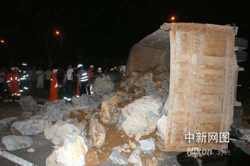 在事故現(xiàn)場,記者看到一輛滿載石頭的工程車側翻壓在一輛面包車上,地面撒滿了玻璃碎片和石頭,面包車嚴重變形,2名人員被困,其中一名女子經(jīng)現(xiàn)場救護人員診斷稱由于失血過多已死亡,另一名被困人員被壓在了工程車下面,不能動彈,生命垂危。
