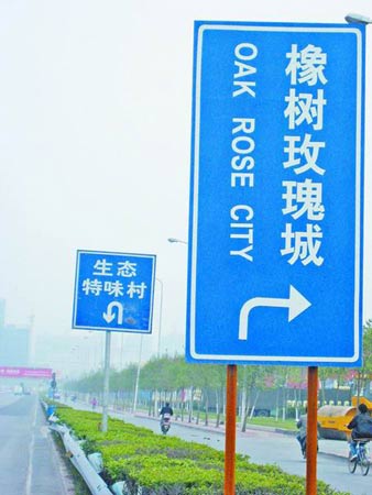 在鄭州市中州大道與南三環(huán)交叉口附近,記者先后看到兩個(gè)酷似交通路牌的廣告牌。藍(lán)色牌子上,分別寫(xiě)著“橡樹(shù)玫瑰城”和“生態(tài)特味村”等字樣,而且都有白色箭頭指示方向。