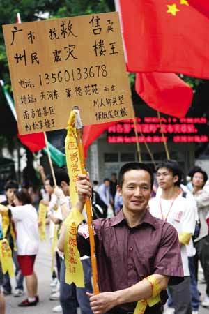 昨日,有一個(gè)人,隨著號(hào)召募捐行動(dòng)的志愿者隊(duì)伍,從正佳廣場(chǎng)西北門的活動(dòng)現(xiàn)場(chǎng)一直跟到另一主會(huì)場(chǎng)僑鑫教育大院。他始終默默站著,沒和任何人說(shuō)話;而他手上,則舉著一塊自己制作的簡(jiǎn)陋牌子,上面寫著“廣州市民抗震救災(zāi)售賣樓王”,引來(lái)好多路人觀望。
