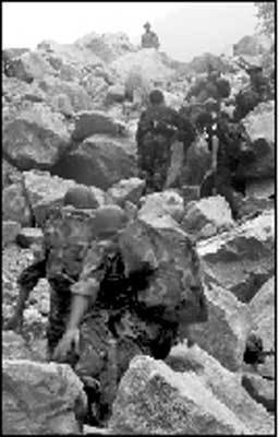 在小分隊(duì)爬行上方20米處,鋼盔大的石頭沖著小分隊(duì)隊(duì)員砸下來(lái)。