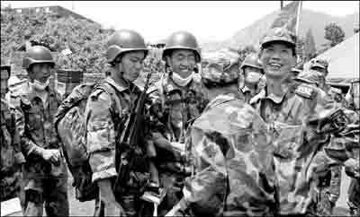 “我們來唱支軍歌吧!2008年5月18日11時30分,空降兵某軍指揮官戴志強站在已成孤島的綿竹市三江村,對前方奔騰而來的巨石大喊時,56名災民已乘坐直升機安然離去。