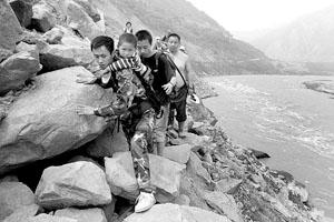 走了大半天,前方的路被新落下的大石擋住,如果要過去,記者必須雙手扒著石頭,側(cè)身挪過。但這樣,孩子便會(huì)被置于半空,萬一孩子手一松,瞬間就會(huì)跌入大江。