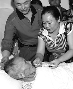 送到醫(yī)院后,老人已陷入昏迷,十多名醫(yī)護(hù)人員立即將老人推進(jìn)病房急救。3名護(hù)士更是守在病床旁連續(xù)呼喊“爺爺,爺爺!”,以對(duì)其模糊的意識(shí)進(jìn)行刺激。用藥2小時(shí)后,老人奇跡般蘇醒過來。不料老人卻對(duì)著醫(yī)護(hù)人員大聲呼喊“我沒有病,我要離開,你們滾!”張貴清趕緊上前握住爺爺?shù)氖郑盃敔,我在這里呢?”見到孫子在,老人才平靜下來。“爺爺患有老年癡呆,他只認(rèn)得到我,所以見到醫(yī)護(hù)人員才會(huì)破口大罵。我感到很不好意思,熱情的重慶醫(yī)護(hù)人員受委屈了!”昨天,張貴清面對(duì)醫(yī)護(hù)人員深深鞠躬以表謝意和歉意。(記者 陳宇)