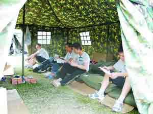 四川省北川中學(xué),這塊明顯有些泛舊的校牌,此時端正地懸掛在位于綿陽市長虹培訓(xùn)中心一座二層小樓的外墻上。培訓(xùn)中心的大門被拳頭粗的鐵鎖牢牢關(guān)緊,只有當(dāng)教職員工或記者進出時,才會擠出一條狹窄的縫隙。走進其中,人們可以看到一座座整齊排列的綠色迷彩帳篷,不時會有孩子們擦身而過。他們的臉上沒有憂傷,盡管他們才剛從夢魘中驚醒。
