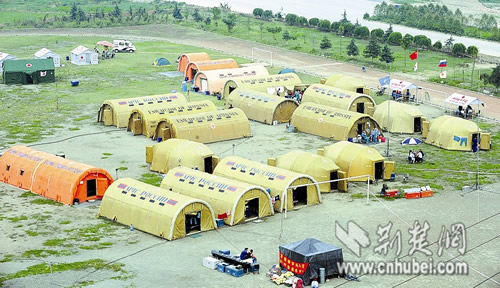 5月24日,汶川大地震后第12天,陽光投射在彭州市職業(yè)中學(xué)操場(chǎng)上的20座巨型充氣帳篷上,不時(shí)有高鼻深目的“老外”進(jìn)進(jìn)出出。