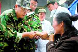 這邊的診斷才剛結(jié)束,那邊又傳來新的情況。有位年過八旬的老人跑過來,請(qǐng)醫(yī)生到帳篷里為自己的女兒診治。將軍二話不說,立即派出心胸外科主任李魯跟著村民坐上自己的越野車,直奔那位村民所住的帳篷!拔覀冞@個(gè)流動(dòng)醫(yī)療隊(duì)就是這樣,沿途看到哪里有災(zāi)民居住的帳篷,就會(huì)過去詢問是否需要醫(yī)藥,使那些地處偏遠(yuǎn)或行動(dòng)不便的群眾能夠得到醫(yī)療救助!