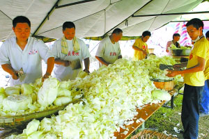 土坡上挖幾個大坑,直徑一米多的大鐵鍋架起來,半鍋水沸騰,直徑一米的大圓木桶立在鍋中!盎鹜c,再旺點!币粋小伙兒往坑內(nèi)塞木板,他五米外的木板堆,近一人高。旁邊大桶的米飯率先出爐,廚師劉福彬用臉盆當(dāng)飯勺。煮飯區(qū)旁邊,堆起的圓白菜面積像籃球場那么大。幾位女廚用大刀切菜。
