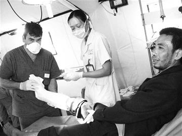 昨日上午10點半,設在綿竹孝德鎮(zhèn)的意大利醫(yī)療野戰(zhàn)醫(yī)院手術室里抬進了一名在地震中骨折的傷者。汗水從骨科醫(yī)生朱力亞諾·羅迪尼的額頭上滲出來,他一邊比劃著詢問傷者的情況,一邊用藥物清洗已經感染的部位。此刻,對朱力亞諾·羅迪尼這樣的國際志愿者來說,他只知道自己是醫(yī)生,他要醫(yī)治好更多的傷者。