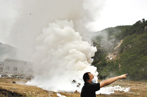 昨天下午3時35分,北川擂鼓鎮(zhèn)突然升起漫天的煙霧,鎮(zhèn)中心全部籠罩在濃煙之下,部分地方能見度為零(見上圖)。現(xiàn)場的中國疾控中心工作人員說,煙霧是因消毒干粉、漂白粉等消毒劑自燃產(chǎn)生的。這已經(jīng)是擂鼓鎮(zhèn)三天內(nèi)連續(xù)第三次發(fā)生消毒劑自燃事件。自燃產(chǎn)生的氯氣,共導(dǎo)致近百人出現(xiàn)呼吸困難、嘔吐等癥狀,他們已被送至野戰(zhàn)醫(yī)院救治。