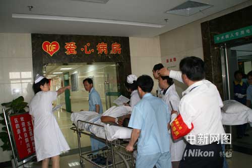 記者坐上載著傷員救護(hù)車,警車開道一路綠燈直達(dá)救治的醫(yī)院,在車上傷員家屬告訴記者:到處都是我們的親人,一路上大家都很受照顧,已經(jīng)感受到家庭的溫暖。下午四時(shí)許,駛進(jìn)蘇北醫(yī)院,為了迎接傷員,醫(yī)院早就開始了準(zhǔn)備,在住院十病區(qū)開辟了 “愛心病區(qū)”。王靜成院長(zhǎng)稱,這是我們醫(yī)院最好的病房,醫(yī)院為四十名災(zāi)區(qū)傷員親人配備了經(jīng)驗(yàn)豐富的醫(yī)護(hù)人員,確保醫(yī)療安全,盡量降低致殘率,讓他們安心治病、早日康復(fù)。