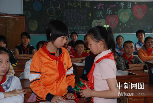 中新網(wǎng)吉林6月5日電(蒼雁)四川什邡地震災(zāi)區(qū)的女孩廖涵來(lái)吉林市投奔親屬,豐滿區(qū)英語(yǔ)實(shí)驗(yàn)小學(xué)免費(fèi)安置其入學(xué)。端午節(jié)前夕,吉林市另一所學(xué)校的一名12歲女孩帶著全班64名學(xué)生的心愿前去探望廖涵,并送去祝福荷包。