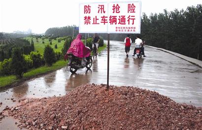 昨日中午,記者在漢江蔡甸永固堤入口處看到,干堤道路已被沙土擋住,豎有一塊“防汛搶險”的警示牌。前行數(shù)百米,至永固堤中段,可見堤頂?shù)乃嗦访嬗写笃荩瑑筛軓牡躺泶┻^。經(jīng)測量,塌陷處長15米,寬8米,最大塌陷深度約0.3米。